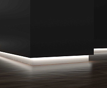 Особенности монтажа: Уложите ламинат так, чтобы его край заходил под будущий профиль, но не упирался в стену. Нанесите «жидкие гвозди» зигзагом на тыльную сторону профиля. Приклейте профиль к ровной стене прямо поверх ламината. Заштукатурьте верхнюю кромку профиля, чтобы она слилась со стеной. Зашпаклюйте и покрасьте стену как обычно.